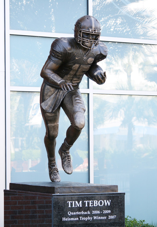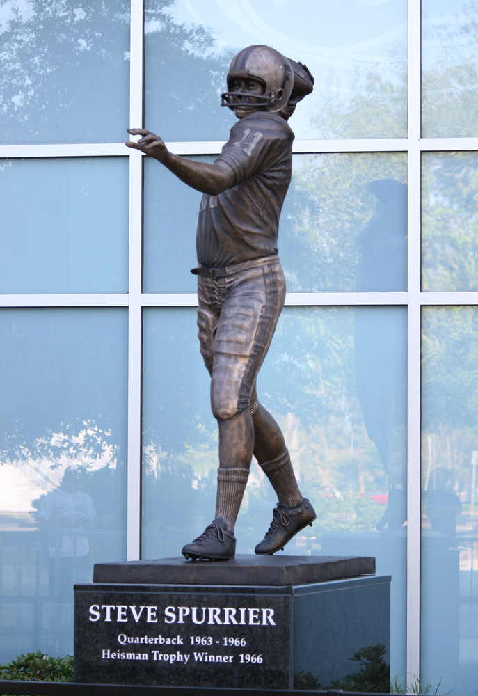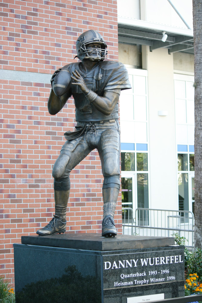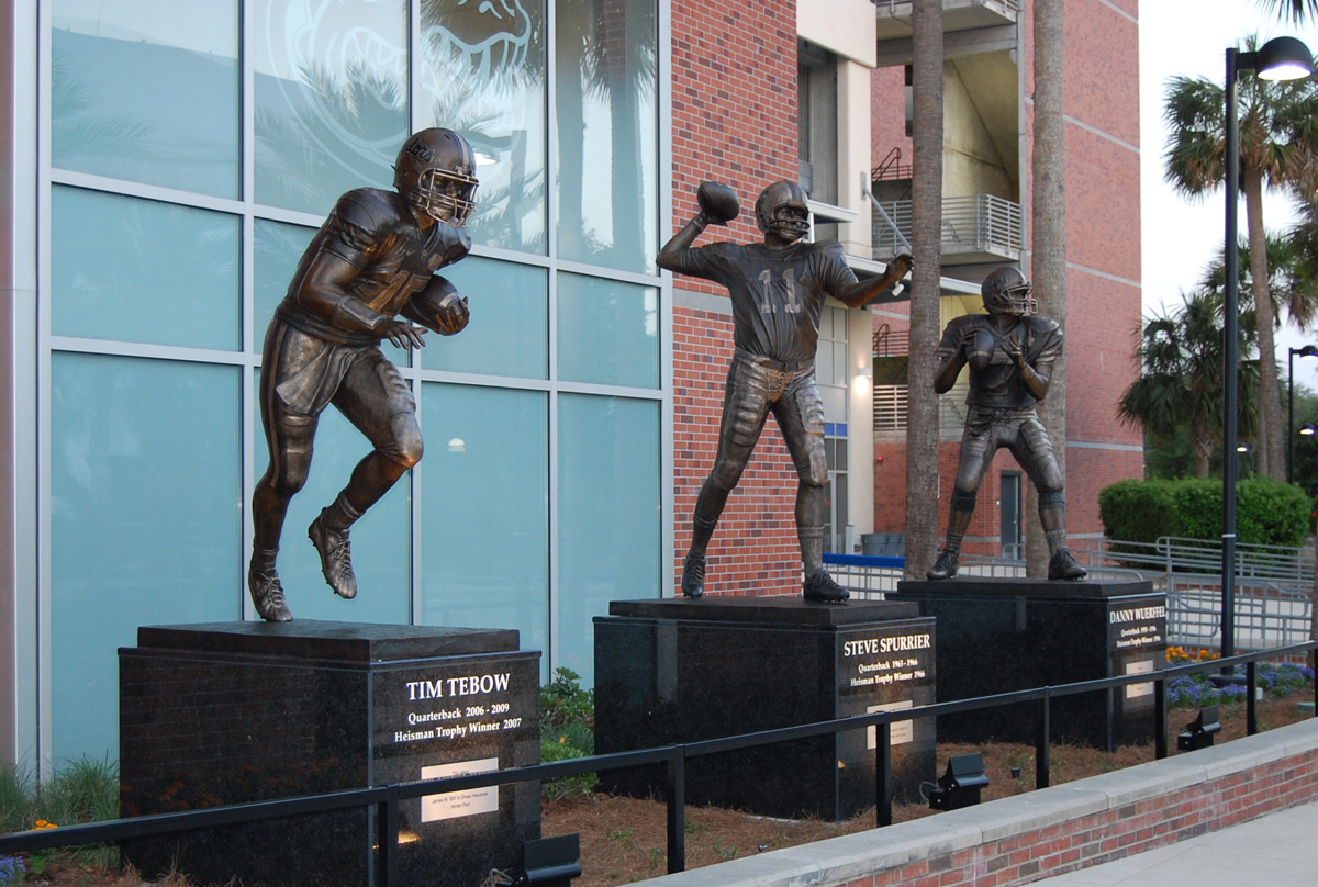 Larger than life-size portrait bronze commissioned sculptures commemorating these three athletes’ Heisman Trophy wins.